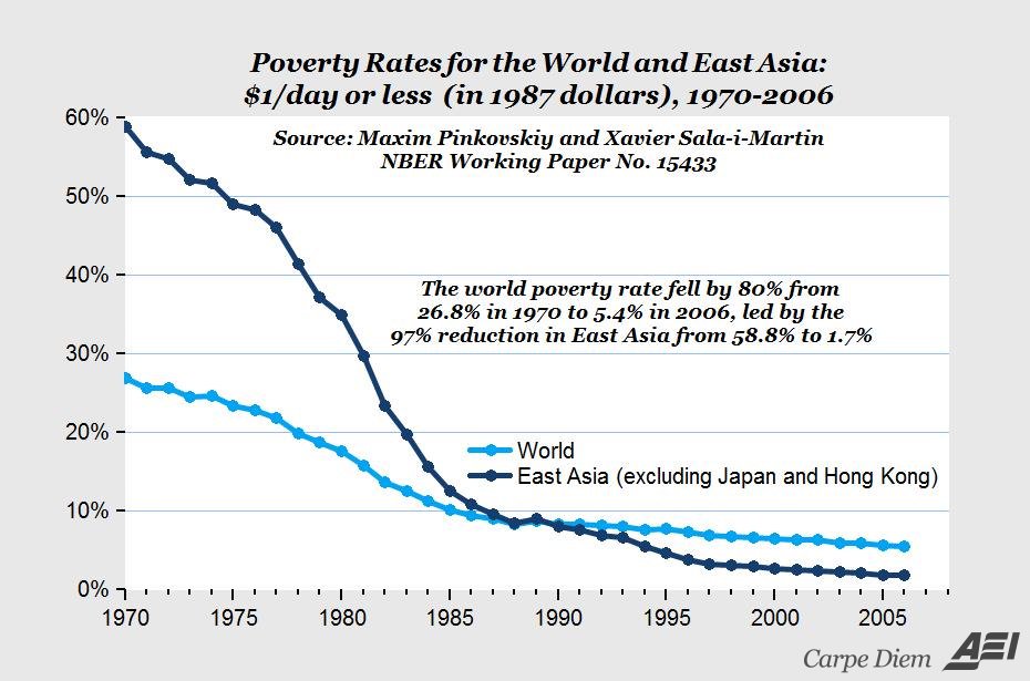 Pope Francis has been excoriating capitalism lately, blaming it for causing global injustice and climate change, and even comparing the excesses of unfettered capitalism to the “dung of the devil.” The pontiff’s strong anti-capitalism message reminded me of the chart above. In a CD post in 2013, I suggested that a slightly different version of the chart could perhaps qualify as the “chart of the century” because it illustrates one of the most remarkable achievements in human history: the 80% reduction in world poverty in only 36 years, from 26.8% of the world’s population living on $1 or less (in 1987 dollars) in 1970 to only 5.4% in 2006 (light blue line), led by the 97% reduction in the poverty rate in East Asia (excluding Japan and Hong Kong) from 58.8% to 1.7% over that time period. The data in the chart come from a 2009 NBER working paper “Parametric Estimations of the World Distribution of Income,” by economists Maxim Pinkovskiy (MIT) and Xavier Sala-i-Martin (Columbia).