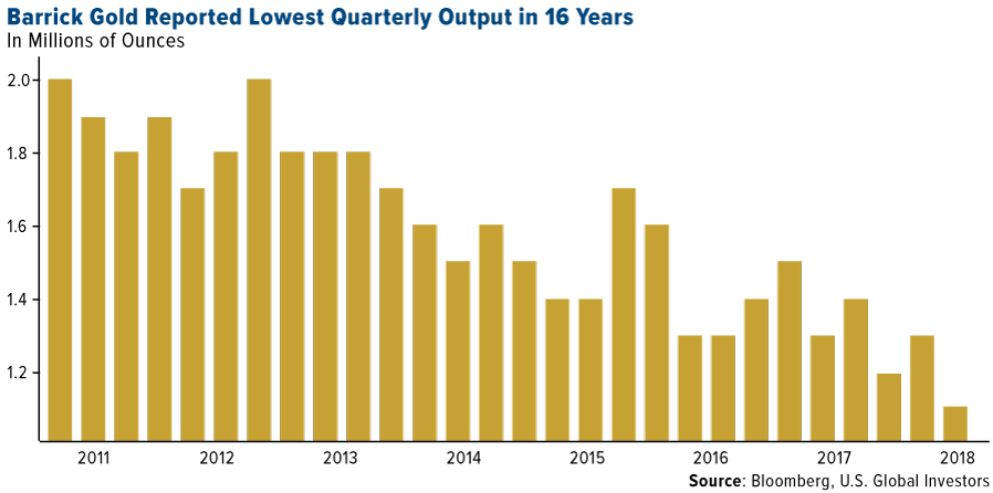 This week the China Gold Association announced that the country, the largest producer of gold, produced 98 million metric tons in the March quarter, down some 3 percent from the same period last year. This comes after total Chinese output in 2017 fell 6 percent year-over-year to 426 million tons. Granted, miners have been pressured by Beijing to curtail production as part of the government’s enforcement of tougher environmental protection policies, but the decline in output is part of a downward trend we’re seeing across the board, especially among major producers.