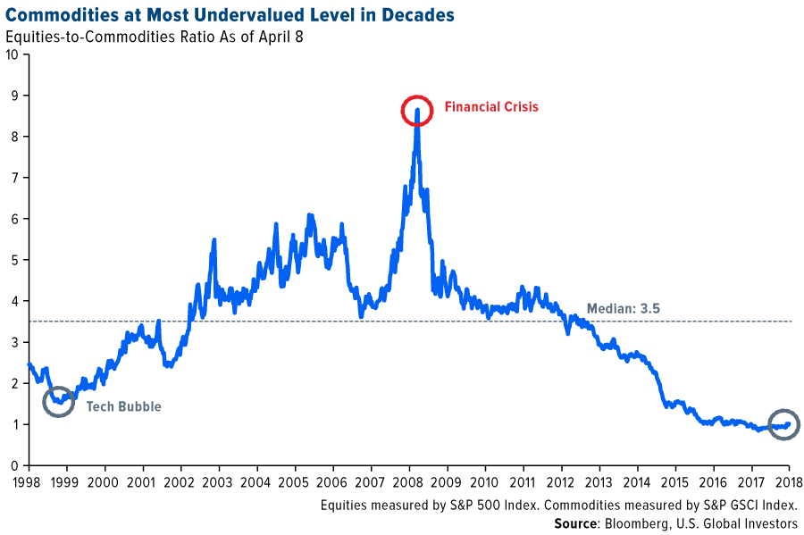 Since the commodities supercycle unwound nearly 10 years ago, many investors have been waiting for the right conditions to trigger mean reversion and lift prices. I believe those conditions are either firmly in place right now or, at the very least, in their early stages. Among them are factors I’ve discussed at length elsewhere—a weaker U.S. dollar, a steadily flattening yield curve, heightened market volatility, overvalued stocks, expectations of higher inflation, trade war jitters, geopolitical risks and more.