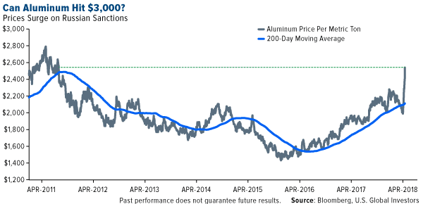 Aluminum is likewise enjoying a strong rally, jumping sharply more than 23 percent since the White House announced sanctions against select Russian firms and oligarchs in response to the Eastern European country’s alleged interference during the 2016 presidential election. In nine of the past 11 trading days through yesterday, the metal posted positive gains, surging nearly 6 percent on Wednesday alone.