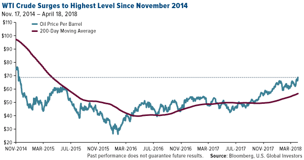 Since its low of $26 per barrel in February 2016, the price of West Texas Intermediate (WTI) crude has surged nearly fivefold and is currently at its highest level in more than three years. On Wednesday, oil jumped nearly 3 percent on reports that U.S. inventories had fallen more than expected, suggesting the global glut continues to recede. Yesterday, WTI tested resistance at $70, a level we haven’t seen since November 2014.