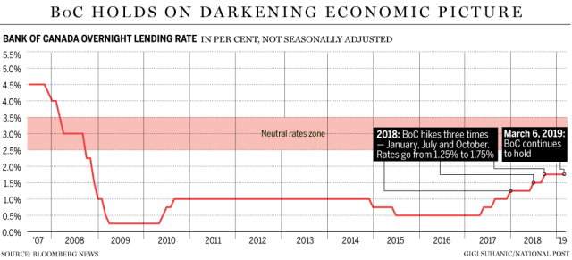 On Wednesday, the Bank of Canada announced it was holding its key interest rate at 1.75 per cent, saying an anticipated economic slowdown in the fourth quarter had been “sharper and more broadly based” than expected.